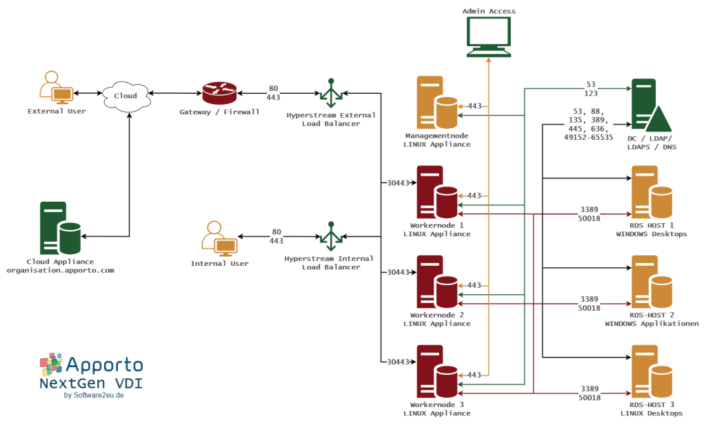 Apporto Appliance Cluster: Ein 3-Knoten-Kubernetes-Cluster (virtuelle Appliances), der RDP-Traffic von deinen VMs/Servers in den Apporto Hyperstream umwandelt.