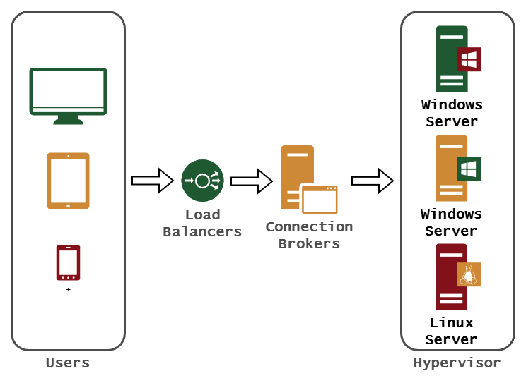 Die Nutzer greifen dann einfach über das Netzwerk (z. B. über das Internet) auf ihren virtuellen Desktop zu. Das heißt, sie können von jedem Gerät aus arbeiten – egal ob Laptop, Tablet, Thin Client oder sogar Smartphone – und sind damit jederzeit und überall voll arbeitsfähig.